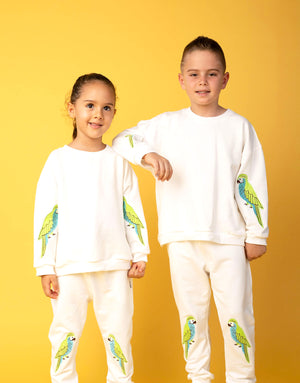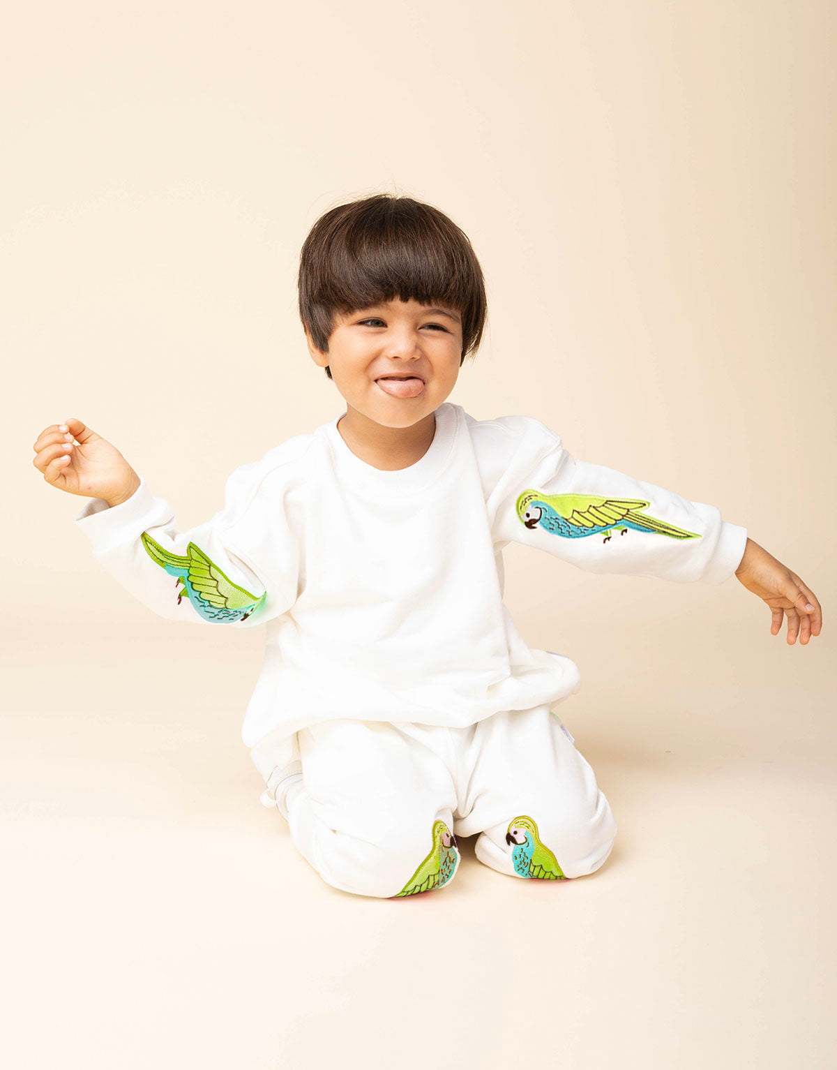 - Tanto el buzo como el jogger cuentan con bordado de loros en suavetina (una tela peluche muy suave) que le da un toque único de diseño
