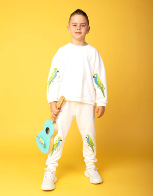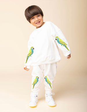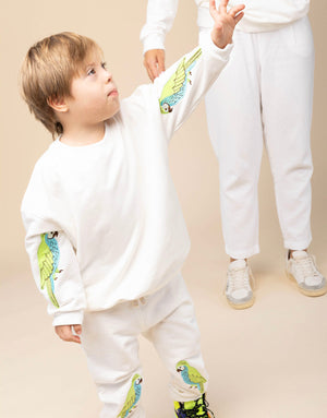 ¡Amarás nuestros conjuntos de buzo y jogger tanto como nosotros! En Dosojos hemos creado un buzo oversized con mucho estilo y un jogger con el fit perfecto para brindar toda la comodidad que los bebés y niños necesitan. Esto lo logramos gracias a la tela burda 100% algodón peruano. El conjunto de buzo y sudadera cuenta con bordado de loros en las mangas y rodillas, elaborado en suavetina (una tela peluche muy suave) que le da un toque único de diseño. El jogger cuenta con resorte en la cintura para adaptarse a diferentes tipos de cuerpo y fit ajustado en los tobillos para mayor comodidad. ¡Un conjunto muy versátil que no puede faltar en el clóset!